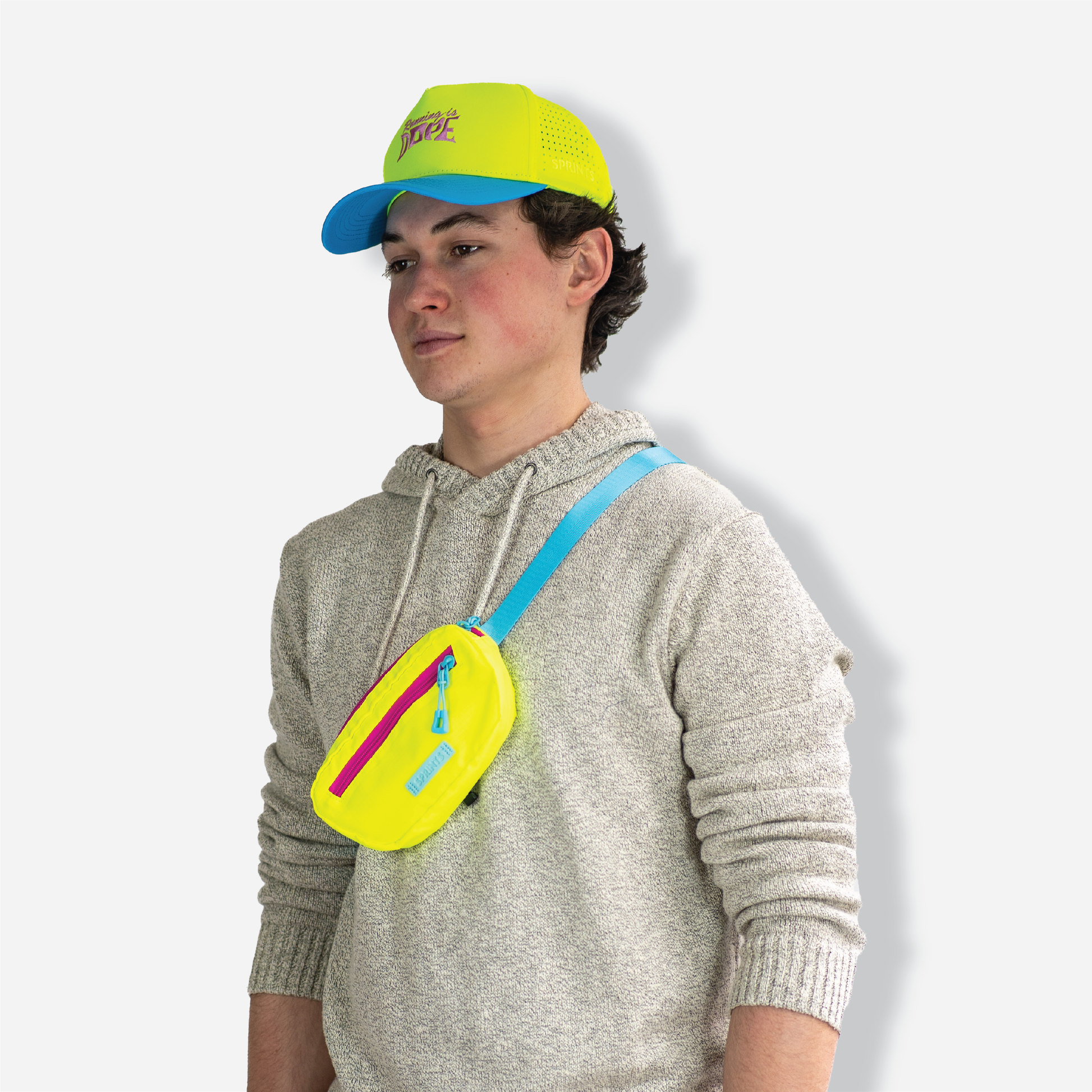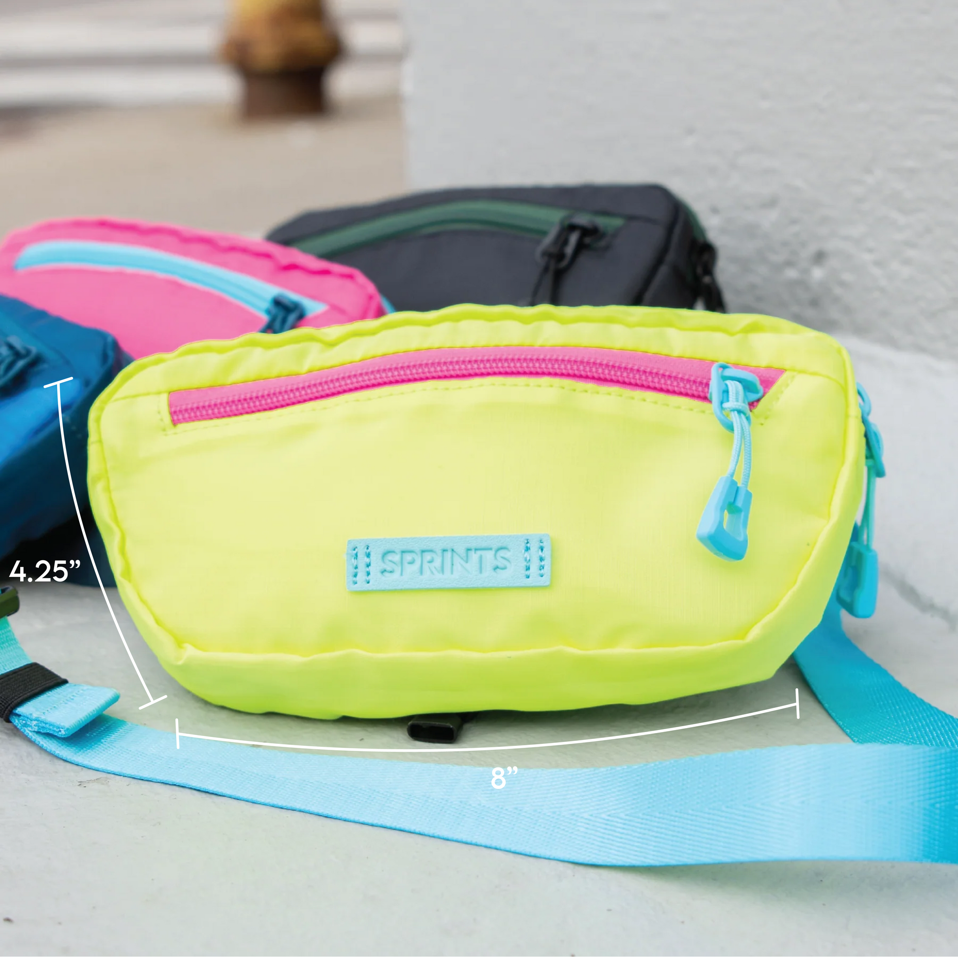 Sprints cross body Sling It bags are here to revolutionize your run. Designed to keep up with your every move, you can say goodbye to annoying bouncing bags and focus on what really matters - rocking your run. At 8” x 4.25” x 1.25” they are the perfect size to fit any iPhone, keys, workout gels, headphones, your wallet, chicken tenders, and more. Two zippered pockets for easy organizing, a removable second strap and a loop for hat storage, so your Sling It isn’t lonely.