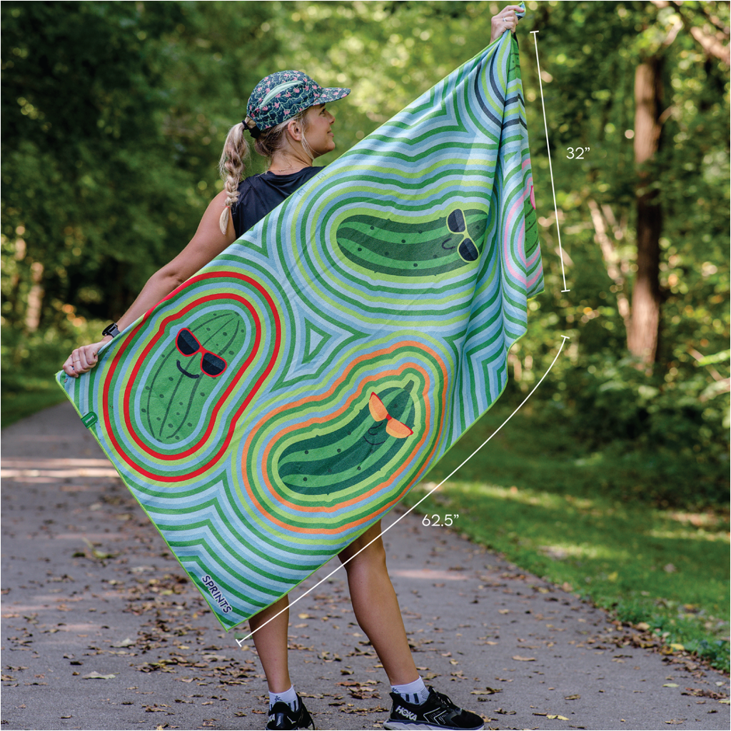 Sprints microfiber performance-wicking towels wipe away the salty brine from your workouts and have a special slot to allow you to cover your car seat to protect from any pickle juices. It has been scientifically proven that pickles make you a superior athlete, what will science say about the pickle power towel?