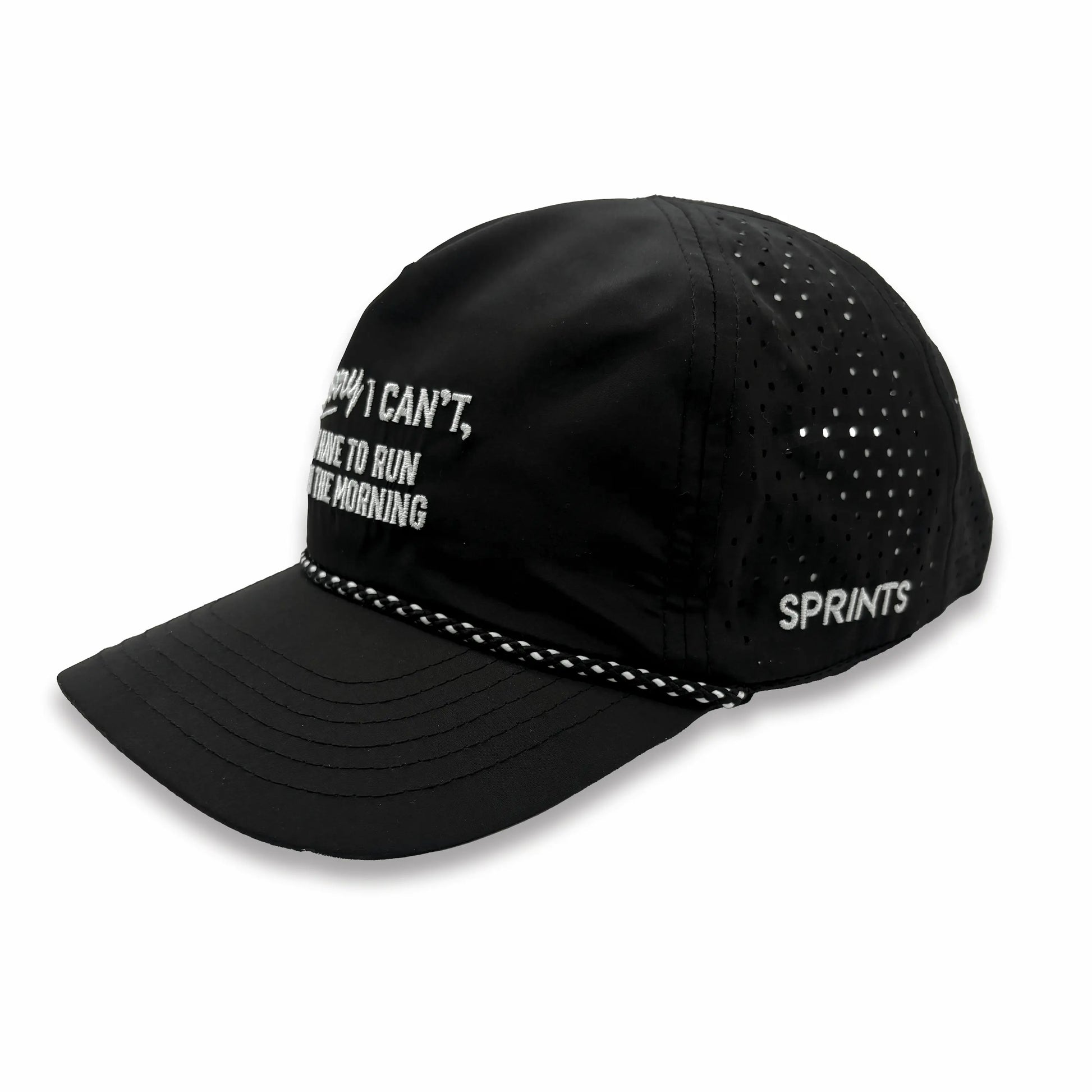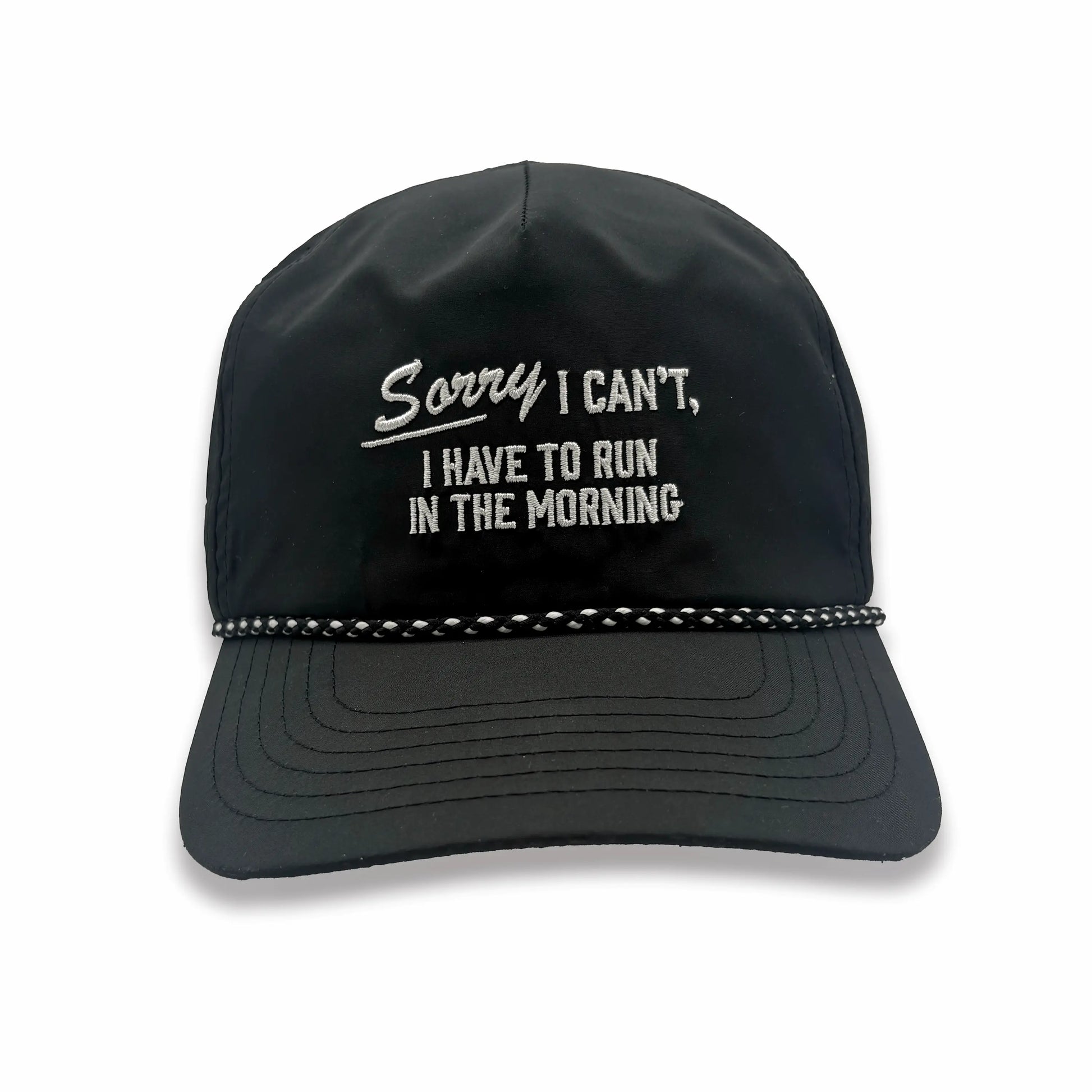 This Sorry I Can't - EZ Rope Snapback keeps it classic with an all-black build and a black-and-white rope over the bill—subtle enough to wear anywhere, bold enough to warn people you will absolutely check your watch mid-conversation.