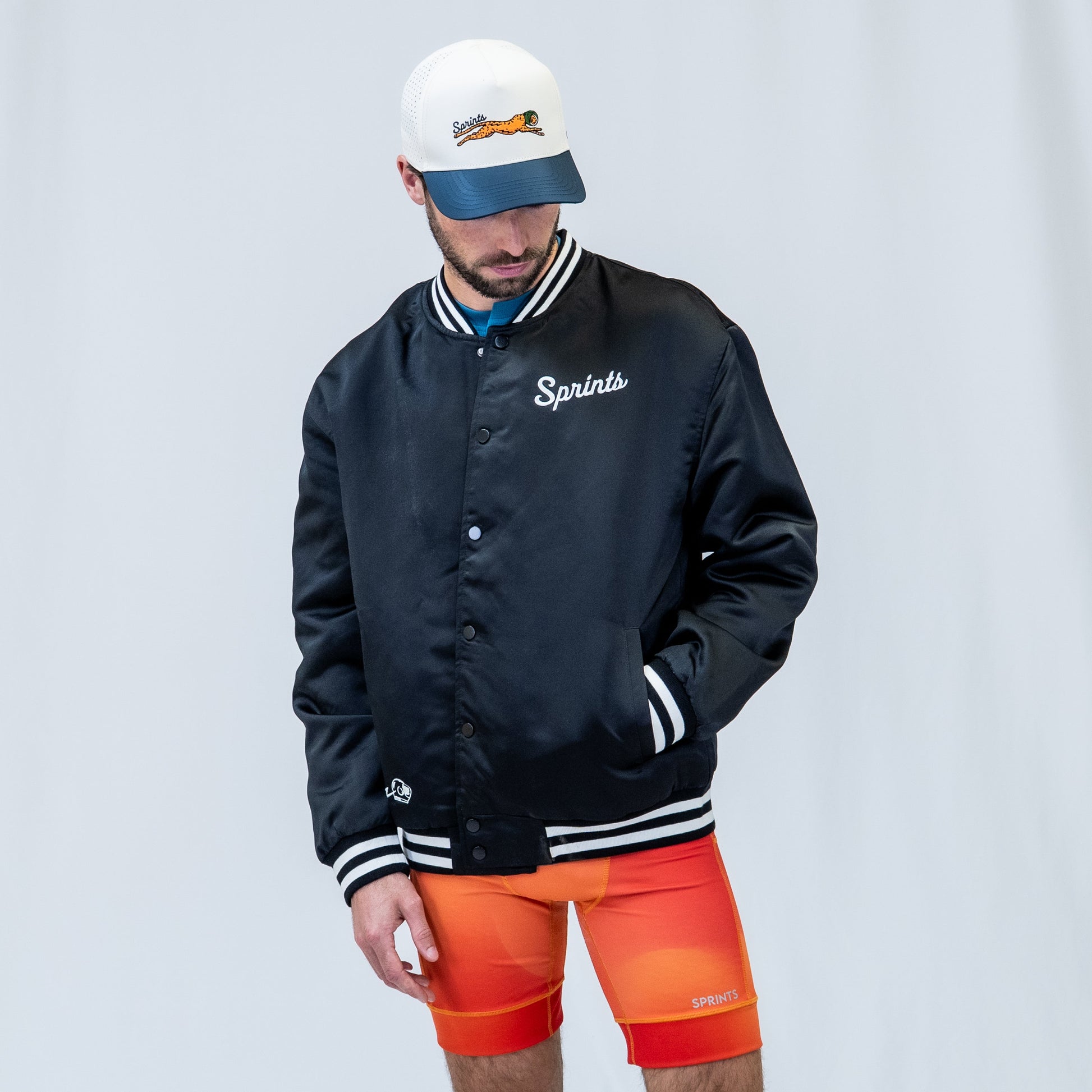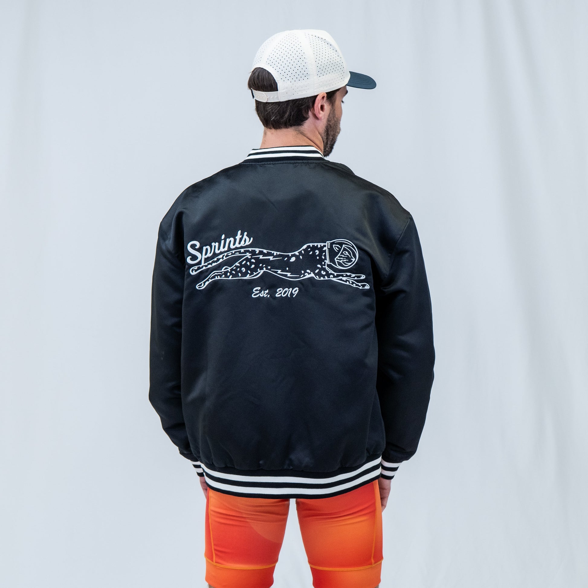 A bomber jacket but make it fast (looking). Built with a satin shell and quilted interior, it’s got that old-school letterman feel with a modern, relaxed fit. Finished with ribbed details and Miles the Jag at full speed, it’s equal parts iced out retro and wearable leisure drip. Extremely limited quantities.