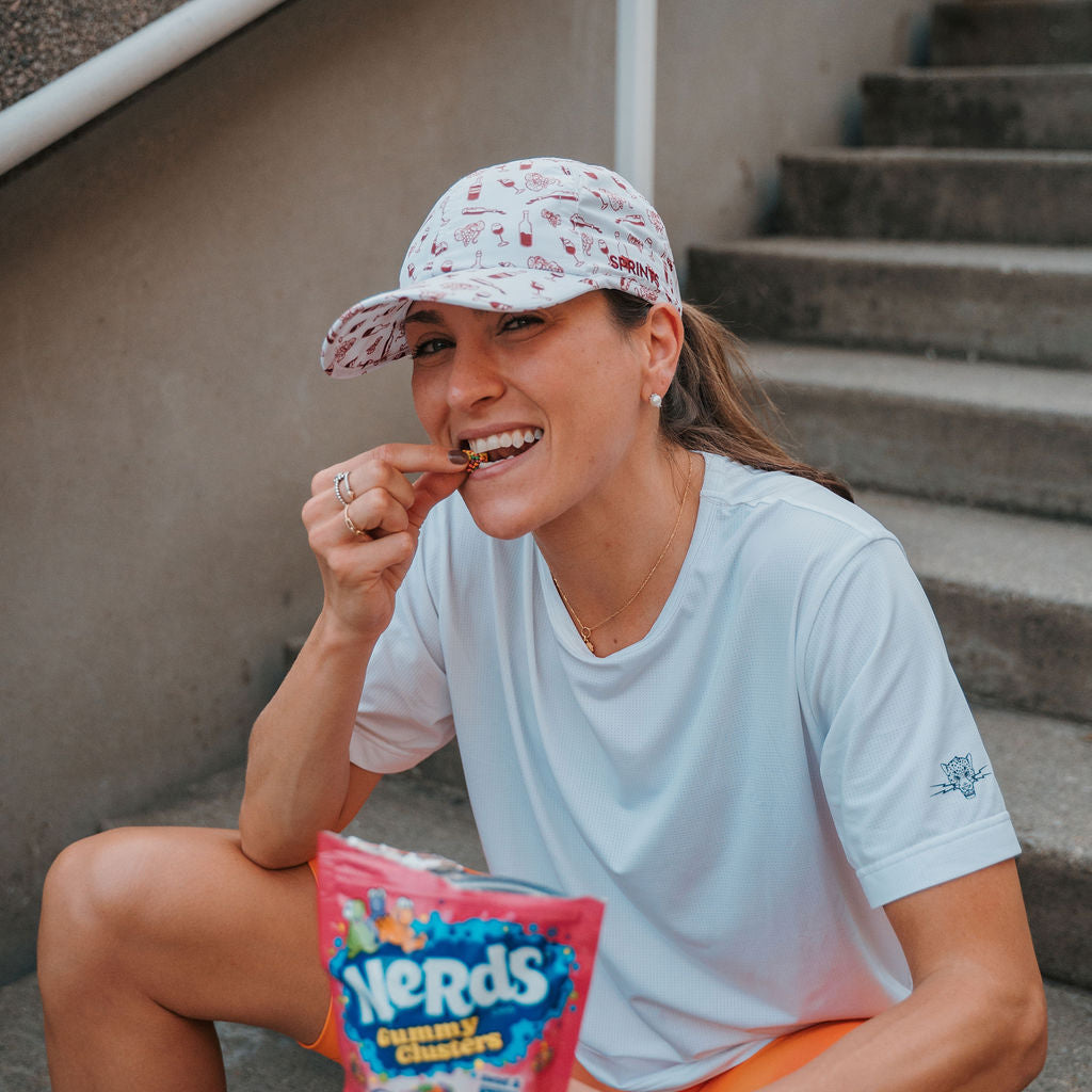 Not with wine. Not after wine. For wine. This hat is for the grape-chasers, the finish-line-to-cabernet pipeline, the post-run pour prioritizers. Featuring splashes of red wine on a white background, it’s basically a wearable toast to questionable hydration strategies and excellent life choices. Sweat now, sip later (or during we’re not here to judge).